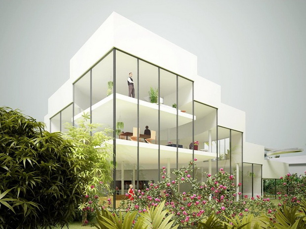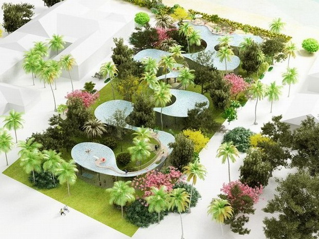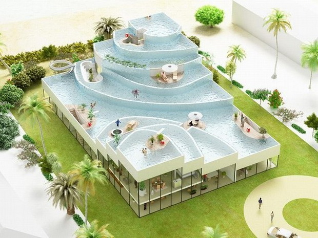 來自荷蘭的NLarchitects建筑事務所總能為我們帶來不一樣的新奇想法,很快他們設想了三個方案。都是將泳池架設在住宅的屋頂,房子的生活區位于泳池下面,以通透的玻璃幕墻圍合。通過泳池的不同形狀與深度劃分出下面的空間,上面的泳池儼然成為一個水上樂園!
